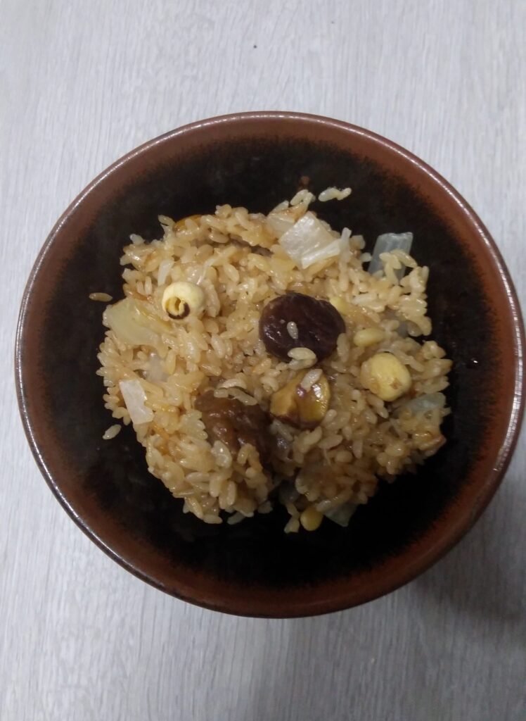 材料(4人分) もち米 1カップ 米 1カップ クコの実 大さじ1 松の実 大さじ1 玉ねぎ 1個 ハスの実 20グラム むき栗 8個 水 2カップ 醬油 大さじ2