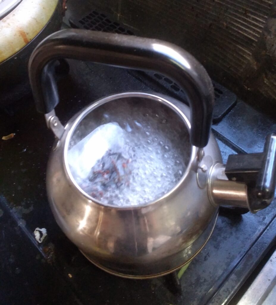 作り方 ① グローブ10gを茶袋にいれ、水1リッターを「やかん」に入れる。 ② 沸騰したら、火を弱火にして5~8分ほど煮て、火を止める。