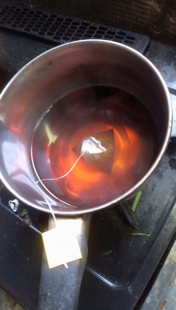 別の小鍋にグローブ湯を取り、紅茶を入れて煮出す。 カップに入れて、黒砂糖を入れる、好みでミルクティーにしてもよい。
