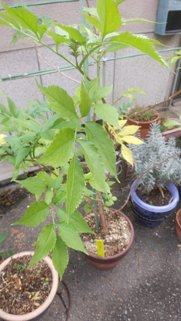 エルダー ハリーポッターと賢者の石、ハリーの魔法の杖の材料です。 花と若葉をお茶にして利用します、まだ木が小さいので、今年は花が咲くか、楽しみにしています。