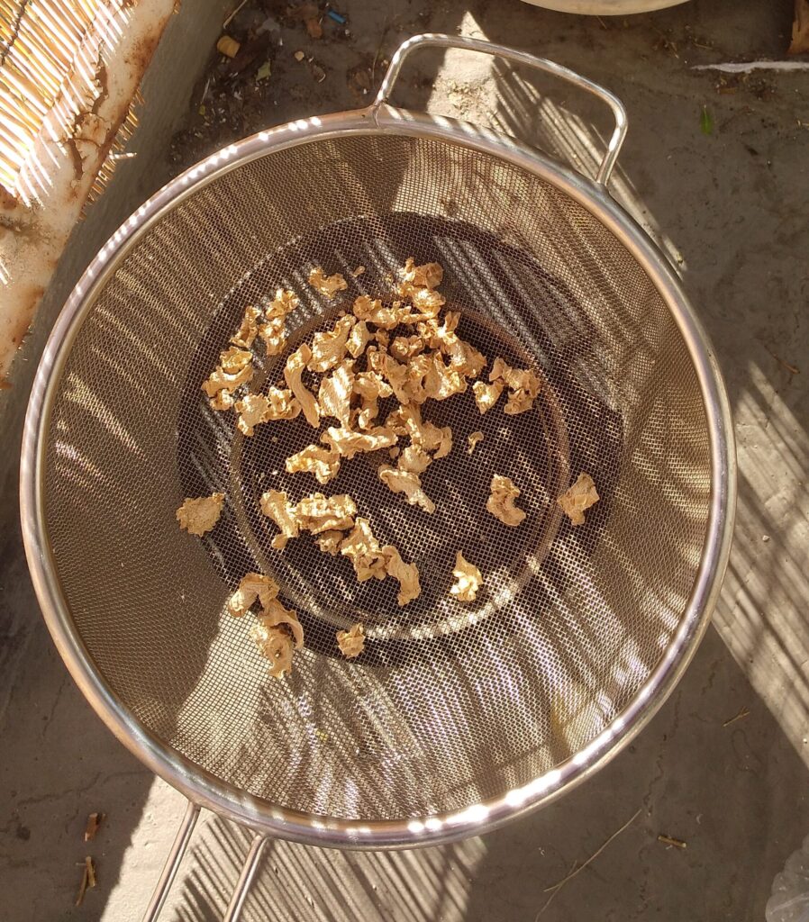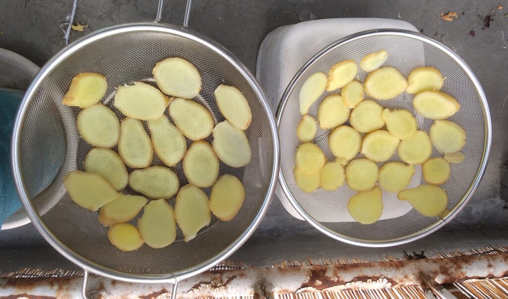 干しショウガになった状態(風とうしの良い所で2~3日干す、完成すれば、乾燥剤とビンに入れ保管