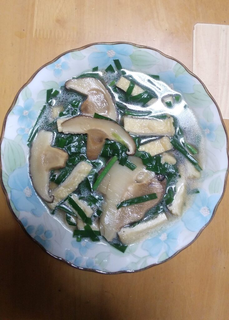 作り方                                 1  ニラは3cm長さに切る。                       油揚げは熱湯を回しかけて油抜きをし、縦半分に切って細切りにする。        干しシイタケは水に浸けて戻し、軸を除いて薄切りにする。             2  鍋にだしと干しシイタケをいれて火にかける。                酒、粗糖を加え、粗糖が溶けたら、しょう油を加えて混ぜ合わせる。           3  油揚げを加えて2分ほど煮て味をみる。                    最後にニラを加え、火が通ったら火をとめる。                  参考資料 日本創芸学院 菜食薬膳講座 text1